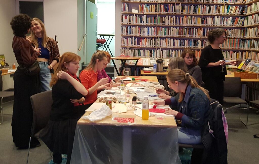 Unser eng gestricktes Programm sah eigentlich vor, dass wir mehr zum Krieg im Sudan erfahren und einen Einblick in den geostrategischen Hintergrund von Gaza und Westasien erhalten. Es zeichnet den Vorstand und alle Teilnehmenden aus, dass wir den aktuellen Geschehnissen Raum gaben und stattdessen zwei unserer Mitglieder von der Lage im Iran, in Rojava und der breiteren Region erzählen ließen. Auch wir anderen hatten die Möglichkeit, unsere Betroffenheit mitzuteilen und von der bedrückenden Kommunikation mit Freundinnen und Kameradinnen im Libanon und in Palästina zu berichten. Empathie geben – an die Menschen im Krieg und mit persönlichen Verbindungen. Empathie empfangen – untereinander. Und so die Spirale von Gewalt, Zerstörung, Traumatisierung und Tod irgendwie verarbeiten. Das abendliche T-Shirt und Taschen Bedrucken und dabei Erzählen trug weiter dazu bei, kreativ standhaft dem Grauen unsere Position entgegenzusetzen.